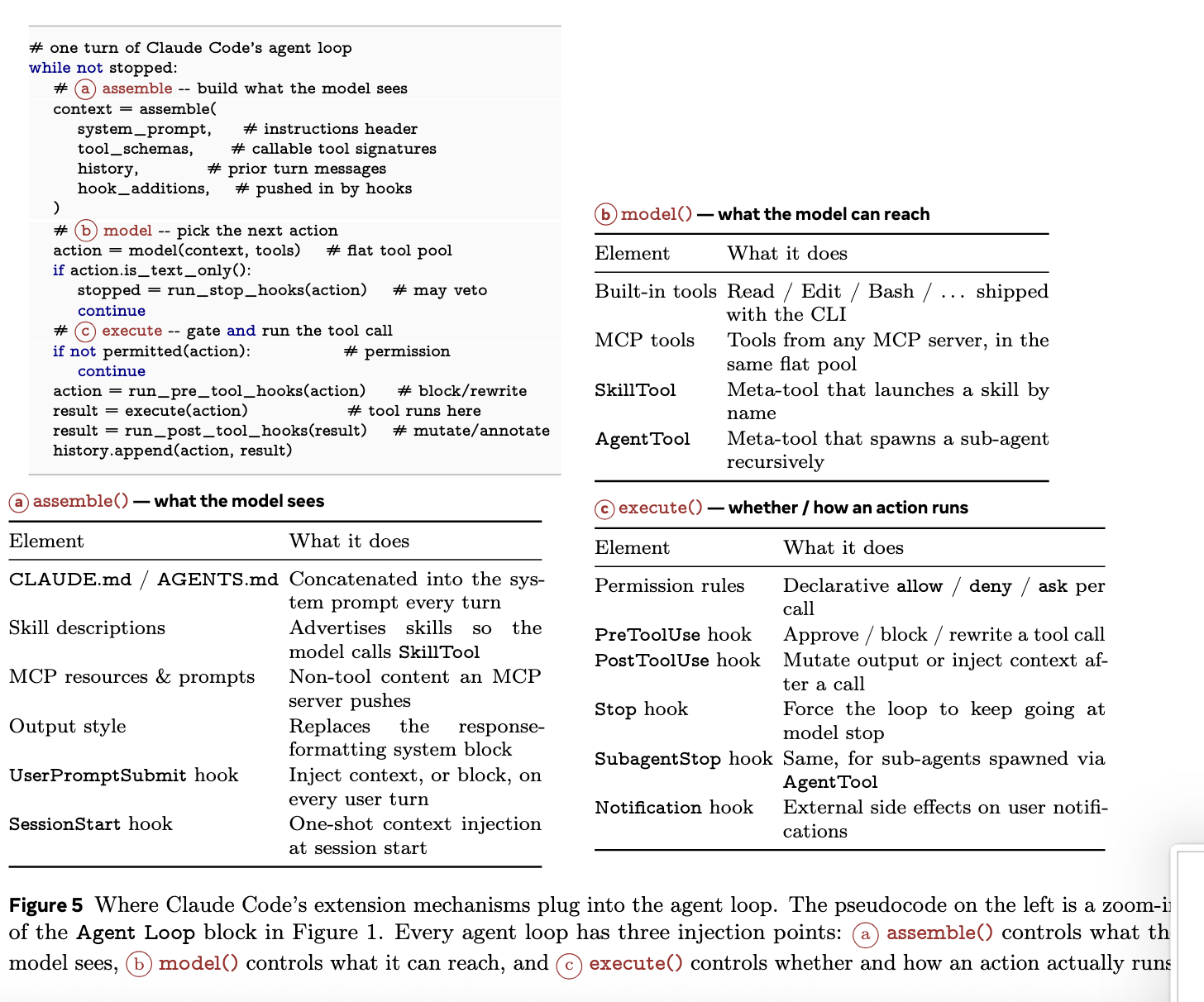 - execute() 阶段:决定工具调用是否执行以及怎么执行。权限规则、PreToolUse / PostToolUse 钩子、Stop 钩子都在这里起作用